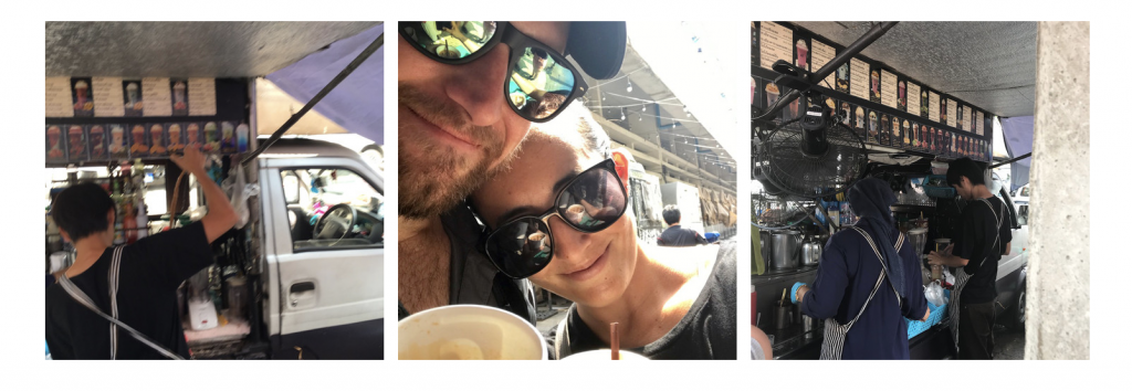 No meal is complete in Thailand without an ice cold and creamy traditional Thai iced tea. It has become one of our favorite treats over the last few weeks in Thailand. We visited one of the most popular tea trucks in Bangkok and had to wait nearly 20 minutes while the morning rush also satisfied their caffeine kick. We watched the tea expert pour the tea from pot to pot across long distances in order to make the tea smooth with added air. Of course no Thai tea would be complete without some sweetened condensed milk, giving it its iconic orange color. Since then, I have learned how to say “less sugar” in Thai when ordering iced tea, which makes me feel a little better about drinking it nearly every day.
