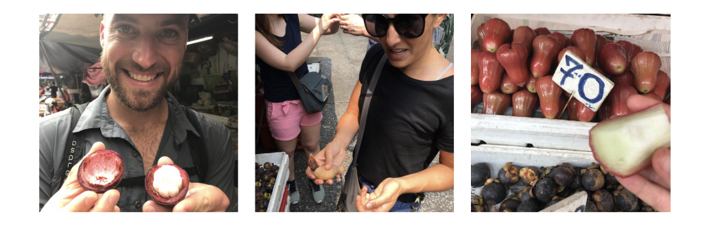 Visiting a local fruit stand was very interesting considering we have been staring at these mysterious fruits for weeks wondering what they are. We learned that the infamous smelly durian is known as the “king of fruits” in Thailand. Several places we’ve stayed so far ban its guests from eating durian with a hefty fine. Luckily we didn’t have to try durian on this tour. Instead, we tasted mangosteen, which is known as the “queen of fruits” since it’s sweet, floral and has a small crown on the top. We tried a nutty shelled fruit similar to dates called tamarind. I found tons bugs crawling inside my tamarind when I cracked it open, which explains my slightly disgusted face. Finally, we sampled a rose apple which was a little tart and juicy with the consistency of a candy apple.