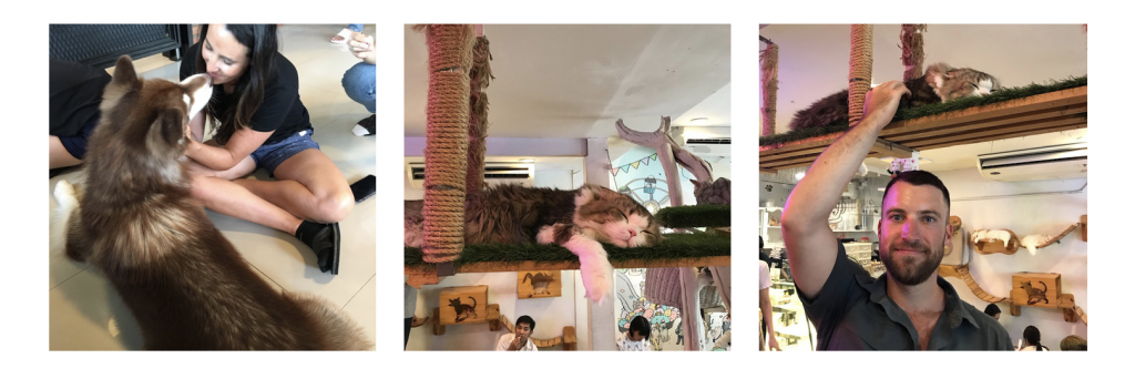 After 3 hours of eating our way through the Village of Love in Bangkok, we felt satisfied, informed and a bit glutinous. We spent the rest of the day sampling the various dog and cat cafes throughout Bangkok. It was the purrfect end to our time in one of the craziest cities we’ve ever been to. Now it’s time for some rest and relaxation on the islands!
