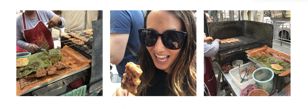 Our first stop of the day was a traditional Thai street food breakfast. It was 10am and I had an empty stomach knowing that I would be eating for the next few hours. The traditional Thai breakfast consisted of grilled pork on a stick that had been marinated in soy sauce and garlic along with a grilled patty of sticky rice. The pork was so tasty, perfectly cooked yet very simple. It was one of my favorite things I ate all day! The sticky rice complimented it well and I just love anything having to do with sticky rice so I was sold.