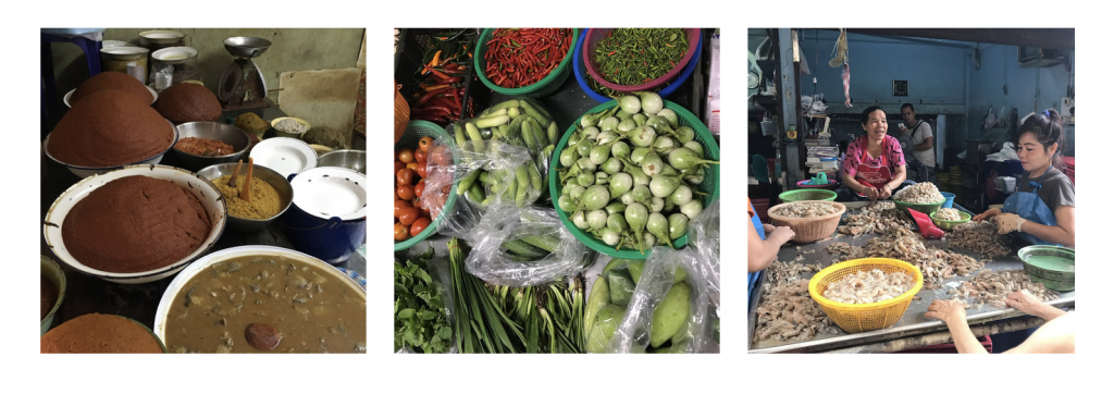 We spent some time strolling through the local wet market, which gets its name because of the constant hose water needed to wash away fish guts and left over meat scraps. We learned all about the numerous ingredients that local women buy here to make Thai curries and stir fries. If they want their food to be authentic, they do not shop at supermarkets because they don’t trust the freshness of the produce.