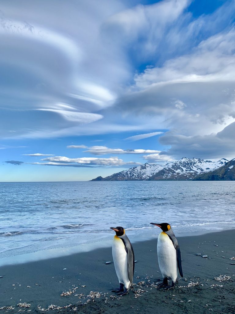 The biggest highlight of South Georgia, however, was St Andrew’s Bay, which we visited on our third day on the island. It is home to the island’s largest king penguin colony, and the view over the raucous, colourful colony is one I will never forget. Penguins in all stages of life—babies, those moulting, and adults—abound against the stunning backdrop of glacier-covered mountains, small ponds and rocky beach. We were also rewarded with a spectacular display of lenticular clouds as we motored away towards the southern stretches of South Georgia. We stopped briefly at Cooper Bay to see macaroni and chinstrap penguins, followed by a cruise of the stunning Drygalski fjord.