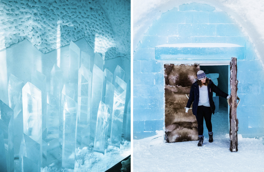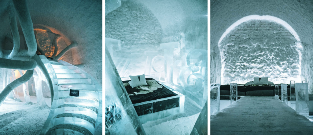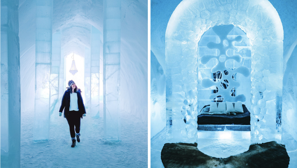 The entrance to the Ice Hotel really builds the suspense and feels straight out of Game of Thrones. Before you even get to the bedrooms, you walk through two large fur-covered front doors. As you make your way down a long, window-less hallway, the magic of the hotel will reveal itself as you near the entrance of the Ice Church. This space operates as an actual Church and is therefore the one consistent part of the Ice Hotel that is always built each year. Weddings and baptisms are common here and up to 150 weddings can occur in one season. The inner hallways of the Ice Hotel are adorned with carved walls, crystal-like pillars and stunning chandeliers made of ice. You’ll laugh when you notice how instead of looking forward to where you’re walking, you and everyone around you will be looking up and literally every which way to catch all the details.