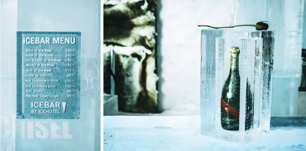 Now what would an Ice Hotel be without an Ice Bar? Rational question right? Especially since Ice Bars have popped up all over the world, even in hotter climates like Rome and Miami. Once you tour the temporary Ice Hotel, you can make a stop in the building next door: the much newer Ice Hotel 365. This building was created so people could experience living in the cold year-round, even in the summer. It’s also the home of the Ice Bar (sponsored by Absolut Vodka) where drinks are served in glasses and goblets made completely of ice. The top drinks of choice are the local non-alcoholic lingonberry juice, and of course, anything mixed with vodka. You have a rare chance to drink the liquor at its optimal temperature…freezing, guaranteeing a really delicious cocktail.
